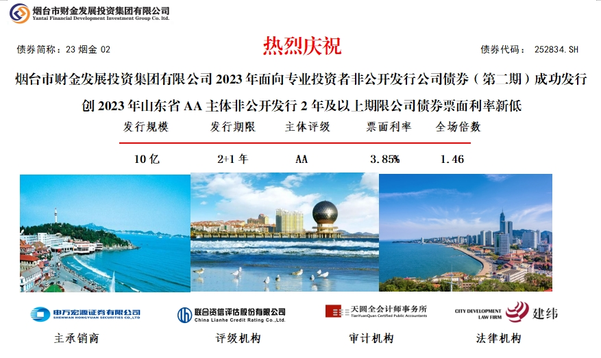 10月24日,煙臺財金集團2023年面向?qū)I(yè)投資者非公開發(fā)行公司債券(第二期)在上交所成功發(fā)行!本期債券發(fā)行規(guī)模10億元,期限3年(2+1),票面利率3.85%,全場認購倍數(shù)1.46倍,創(chuàng)2023年山東省AA主體非公開2年及以上期限公司債券票面利率新低,也是集團繼6月成功發(fā)行“23煙金01”公司債券后,半年內(nèi)再次刷新山東地區(qū)同級別同期限非公開發(fā)行公司債券最低利率記錄。本期債券發(fā)行由申萬宏源證券有限公司主承,聯(lián)合資信、天圓全會計師事務(wù)所及建緯律師事務(wù)所分別提供信用評級、審計和法律服務(wù)。