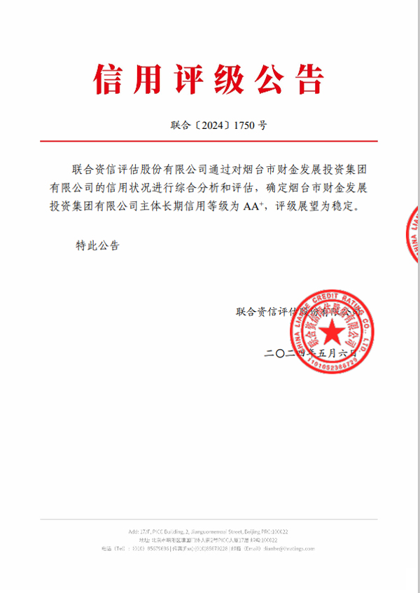 5月6日,經(jīng)國(guó)內(nèi)專(zhuān)業(yè)評(píng)級(jí)機(jī)構(gòu)聯(lián)合資信評(píng)估股份有限公司綜合分析評(píng)定,煙臺(tái)財(cái)金集團(tuán)主體信用評(píng)級(jí)成功由“AA”上調(diào)至“AA+”,評(píng)級(jí)展望為“穩(wěn)定”。