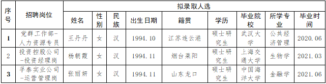 按照2020年8月28日發(fā)布的《2020年煙臺財金集團面向“雙一流”和全球TOP200高校畢業(yè)生公開招聘簡章》相關規(guī)定,經過簡歷收集、資格審查、初試、復試、集體決策等環(huán)節(jié),擬確定部分崗位錄取人選(詳見下表),現予以公示,公示期為5個工作日(11月10日至11月17日)。