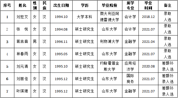 按照2020年11月27日發(fā)布的《煙臺財金集團關于面向“雙一流”和全球TOP200高校畢業(yè)生公開招聘事項調整的公告》相關規(guī)定,經過簡歷收集、資格審查、初試、復試、集體決策等環(huán)節(jié),擬確定錄取人選(詳見下表),現予以公示,公示期為5個工作日(12月22日至12月29日)。公示期間如有異議,請與煙臺市財金發(fā)展投資集團有限公司聯系,電話:0535-6887160。